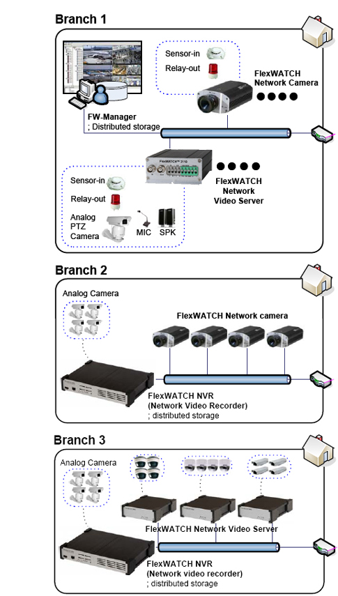 Enterprise IP surveillance software could have various configuration. Still they tend to form headquarter and branch configuration in many cases according to physical subnet or logical division of a department, because there is physical limitation such as storage capacity, network bandwidth & CPU power in real applications and this model is conmensurate with human perception.